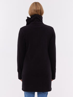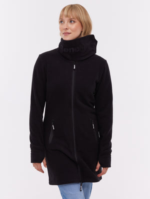 The Bridgit Maxi Wrap Neck Zip-Up by Bench is a sleek fleece coat designed for warmth and comfort. Its standout feature is the oversized wrap collar with tonal Bench branding, offering both style and protection from the cold. With a full-length fit, zip pockets, and thumbhole cuffs, it's built for cozy functionality.