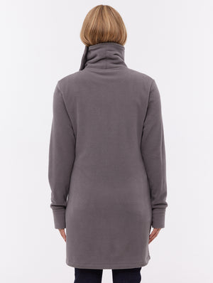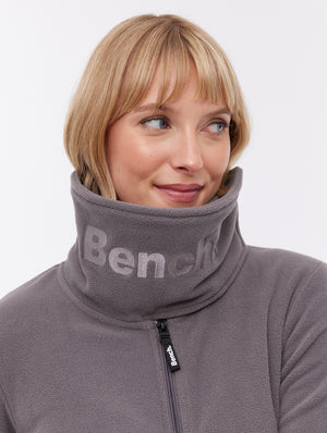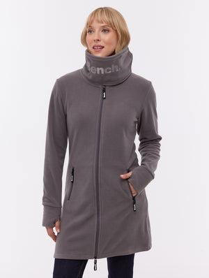 The Bridgit Maxi Wrap Neck Zip-Up by Bench is a sleek fleece coat designed for warmth and comfort. Its standout feature is the oversized wrap collar with tonal Bench branding, offering both style and protection from the cold. With a full-length fit, zip pockets, and thumbhole cuffs, it's built for cozy functionality.